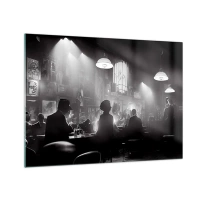 Billede på glas - Sort og hvid jazzscene i et klubinteriør - 70x50cm - I en jazzet stemning - Moderne vægdekoration til stue og soveværelse ARTTOR