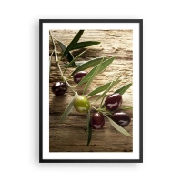 Plakat i sort ramme - Olivengren med grønne og sorte oliven - 50x70cm - Lige fra naturen - Moderne vægdekoration til stue og soveværelse ARTTOR