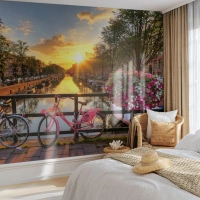 Fototapet Standard Eco - Bro over kanalen med cykler ved solnedgang - 100x70cm - Forårsmorgen i Amsterdam - Moderne vægdekoration til stue og soveværelse ARTTOR