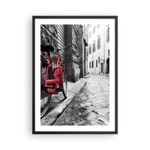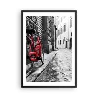 Plakat i sort ramme - En rød cykel på en sort og hvid brostensgade - 50x70cm - Ægte skønhed ældes ikke - Moderne vægdekoration til stue og soveværelse ARTTOR