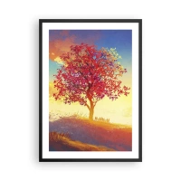Plakat i sort ramme - Et træ med røde blade mod baggrunden af den nedgående sol - 50x70cm - Pilgrim på bestemmelsesstedet - Moderne vægdekoration til stue og soveværelse ARTTOR