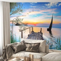Fototapet Selvklæbende Deluxe Sticker - Godaften - Landskab, Sø, træbro - 300x210 cm