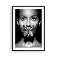 Plakat i sort ramme - Portræt af en kvinde med en sommerfugl på læberne i sort-hvid - 50x70cm - Sommerfuglekys - Moderne vægdekoration til stue og soveværelse ARTTOR