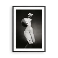 Plakat i sort ramme - Sort-hvidt portræt af en kvinde med blomster - 50x70cm - Excentrisk elegance - Moderne vægdekoration til stue og soveværelse ARTTOR