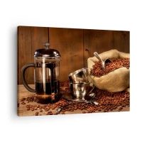 Lærredstryk - Billede på lærred - Fransk presse, kopper og en pose kaffe på en træbaggrund - 70x50cm - Kaffens magi - aroma og smag - Moderne vægdekoration til stue og soveværelse ARTTOR