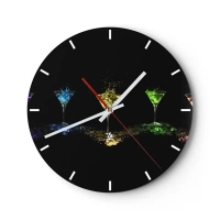 Vægur, Uret - Farverige drinks i glas på en sort baggrund - 30x30cm - Glædens farver i krystalglas - Moderne vægdekoration til stue, køkken og soveværelse ARTTOR