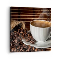 Vægur, Uret - En kop kaffe og spredte bønner på en bambusbaggrund - 30x30cm - Kulets sorthed, ravets gennemsigtighed - Moderne vægdekoration til stue, køkken og soveværelse ARTTOR