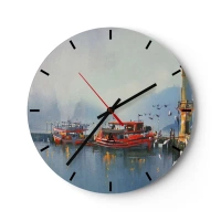 Vægur, Uret - En havn med røde både på roligt vand om morgenen - 30x30cm - Ved verdens ende - Moderne vægdekoration til stue, køkken og soveværelse ARTTOR