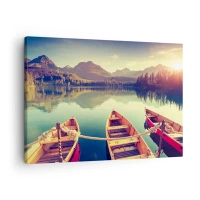 Lærredstryk - Billede på lærred - Både på en rolig sø omgivet af bjerge ved solnedgang - 70x50cm - Lev efter dens love - Moderne vægdekoration til stue og soveværelse ARTTOR
