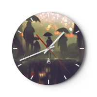Vægur, Uret - Figurer med paraplyer på en regnfuld gade i diffust lys - 30x30cm - Set fra en regndråbes perspektiv - Moderne vægdekoration til stue, køkken og soveværelse ARTTOR