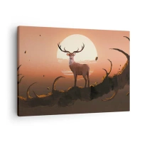 Lærredstryk - Billede på lærred - En hjort mod en solnedgang og et surrealistisk landskab i baggrunden - 70x50cm - Denne aften er ikke som alle andre - Moderne vægdekoration til stue og soveværelse ARTTOR