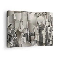 Lærredstryk - Billede på lærred - Abstrakt scene med jazzmusikere i grå nuancer. - 70x50cm - I lydenes rum - Moderne vægdekoration til stue og soveværelse ARTTOR