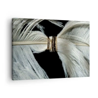 Lærredstryk - Billede på lærred - En hvid fjer med to guldringe på en sort baggrund - 70x50cm - ...og jeg vil ikke forlade dig... - Moderne vægdekoration til stue og soveværelse ARTTOR
