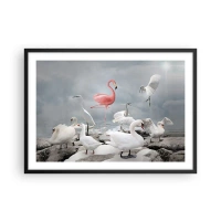 Lærredstryk - Billede på lærred - En lyserød flamingo blandt hvide svaner mod en sø som baggrund - 70x50cm - Hvor kommer jeg fra? - Moderne vægdekoration til stue og soveværelse ARTTOR