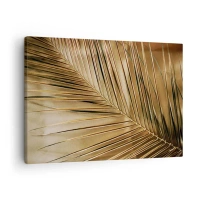 Lærredstryk - Billede på lærred - Gyldent palmeblad på en solid baggrund - 70x50cm - Naturlig kolonnade - Moderne vægdekoration til stue og soveværelse ARTTOR