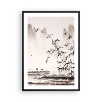 Plakat i sort ramme - Et minimalistisk landskab med bambus i orientalsk stil. - 50x70cm - Stilhed i rismarkerne - Moderne vægdekoration til stue og soveværelse ARTTOR