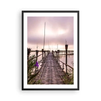 Plakat i sort ramme - Bambusbro over roligt vand i skumringen - 50x70cm - Den stille og rolige atmosfære i Asien - Moderne vægdekoration til stue og soveværelse ARTTOR