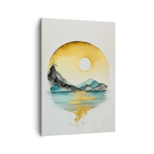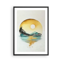Plakat i sort ramme - Et minimalistisk landskab af bjerge over vand i gyldne farver - 50x70cm - I en cirkel af skønhed - Moderne vægdekoration til stue og soveværelse ARTTOR