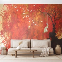 Fototapet Selvklæbende Deluxe Sticker - Vil han flyve med dem? - Abstraktion, Kvinde, Fugle - 500x350 cm