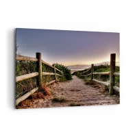 Lærredstryk - Billede på lærred - Træsti i klitterne, der fører til stranden ved solnedgang - 70x50cm - Du kan allerede se målet - Moderne vægdekoration til stue og soveværelse ARTTOR