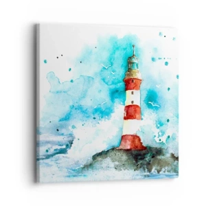 Lærredstryk - Billede på lærred - Et fyrtårn i akvarelfarve med blå baggrund - 70x50cm - Elementernes enhed - Moderne vægdekoration til stue og soveværelse ARTTOR