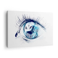Lærredstryk - Billede på lærred - Et øje med et billede af en ugle i akvarelblå nuancer - 70x50cm - Øje mod øje med vildskab - Moderne vægdekoration til stue og soveværelse ARTTOR