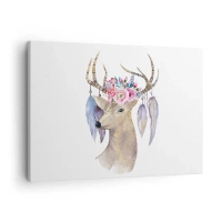 Lærredstryk - Billede på lærred - Romantisk hjortegrafik med blomster og fjer - 70x50cm - Sjælsguide - blid, uskyldig - Moderne vægdekoration til stue og soveværelse ARTTOR