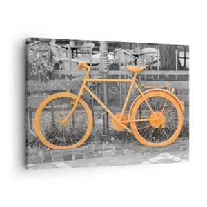 Billede på glas - En illustration af en orangemalet cykel mod en sort-hvid baggrund. - 70x50cm - Gå, jeg venter her - Moderne vægdekoration til stue og soveværelse ARTTOR