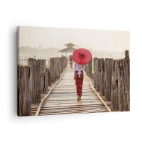 Lærredstryk - Billede på lærred - En kvinde med en rød paraply på en træbro - 70x50cm - På den gamle bro - Moderne vægdekoration til stue og soveværelse ARTTOR