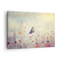 Lærredstryk - Billede på lærred - En fugl mod baggrunden af en farverig eng i pastelfarver - 70x50cm - Fugleportræt med en eng i baggrunden - Moderne vægdekoration til stue og soveværelse ARTTOR