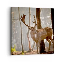 Lærredstryk - Billede på lærred - Hjorte i skoven i morgentågen - 70x50cm - Ungdommens lys - Moderne vægdekoration til stue og soveværelse ARTTOR