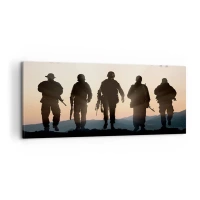 Lærredstryk - Billede på lærred - Silhuetter af soldater og jagerfly mod solnedgangsbaggrunden - 70x50cm - Velkommen til vores verden - Moderne vægdekoration til stue og soveværelse ARTTOR