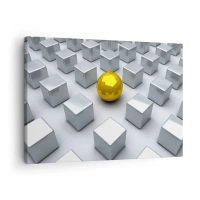 Lærredstryk - Billede på lærred - En gylden kugle, der skiller sig ud blandt sølvterningerne - 70x50cm - Hvorfor mig? Geometrisk sammensætning - Moderne vægdekoration til stue og soveværelse ARTTOR