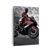 Lærredstryk - Billede på lærred - En motorcyklist på en sportsmotorcykel mod en overskyet himmel - 70x50cm - Mørkets rytter - Moderne vægdekoration til stue og soveværelse ARTTOR