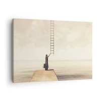 Lærredstryk - Billede på lærred - En kvinde stående på en mole med en stige, der fører op til himlen - 70x50cm - En magisk rejse - Moderne vægdekoration til stue og soveværelse ARTTOR