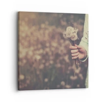 Lærredstryk - Billede på lærred - En hånd, der holder mælkebøtter mod en sløret baggrund af en mark fuld af blomster. - 70x50cm - Behold dem, venligst - Moderne vægdekoration til stue og soveværelse ARTTOR