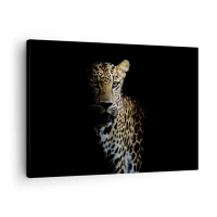 Lærredstryk - Billede på lærred - En leopard på en mørk baggrund med et intenst blik - 70x50cm - Mørk skønhed - Moderne vægdekoration til stue og soveværelse ARTTOR