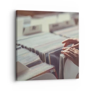 Lærredstryk - Billede på lærred - Hænder kigger igennem en vinylsamling - 70x50cm - På jagt efter følelser - Moderne vægdekoration til stue og soveværelse ARTTOR
