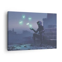 Lærredstryk - Billede på lærred - En hætteklædt figur med magiske fugle i baggrunden af en by - 70x50cm - Livet vil vende tilbage - Moderne vægdekoration til stue og soveværelse ARTTOR