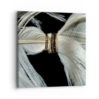 Billede på glas - Nærbillede af vielsesringe på hvide fjer mod en sort baggrund - 70x50cm - ...og jeg vil ikke forlade dig... - Moderne vægdekoration til stue og soveværelse ARTTOR