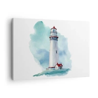 Lærredstryk - Billede på lærred - Et fyrtårn mod en akvarelblå baggrund - 70x50cm - Det blås blide søster - Moderne vægdekoration til stue og soveværelse ARTTOR