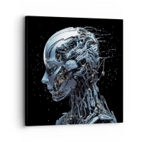 Lærredstryk - Billede på lærred - Futuristisk portræt af en cyborg i industriel stil på en sort baggrund. - 70x50cm - Teknologi er en kvinde - Moderne vægdekoration til stue og soveværelse ARTTOR
