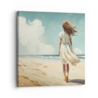 Lærredstryk - Billede på lærred - En kvinde i en hvid kjole går på stranden på en solskinsdag - 70x50cm - At møde solen og vinden - Moderne vægdekoration til stue og soveværelse ARTTOR