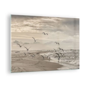 Billede på glas - Fugle på kysten ved daggry i sepia-toner - 70x50cm - Havet brummer, fuglene synger - Moderne vægdekoration til stue og soveværelse ARTTOR