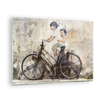 Billede på glas - Et vægmaleri med en cykel og figurer af børn mod en vægbaggrund. - 70x50cm - Sandt eller falsk? - Moderne vægdekoration til stue og soveværelse ARTTOR